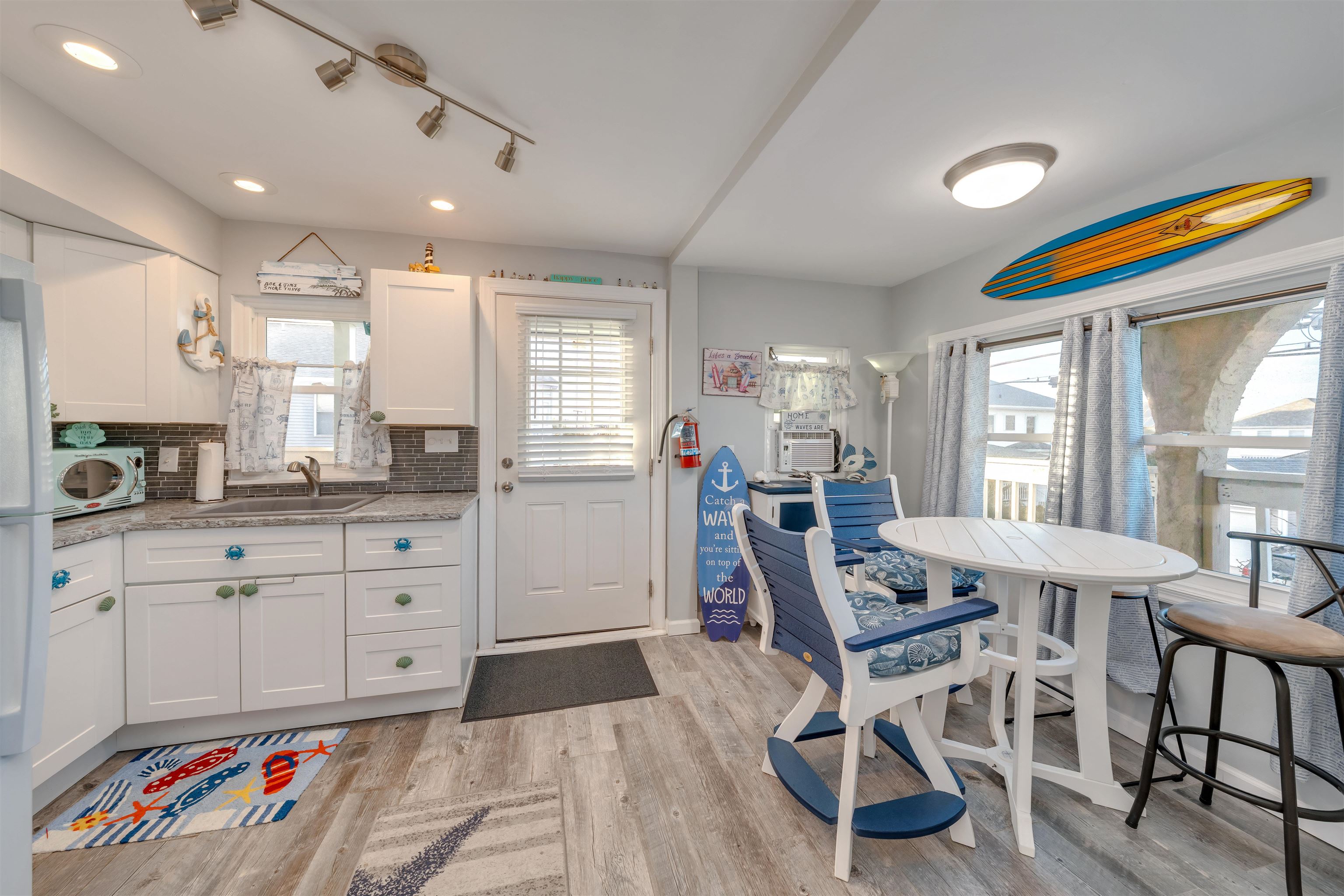 Location, location, location! Just 2 blocks to the beach and close to the Wildwood Boardwalk, restaurants, bakeries, Crest Pier, Scoop Taylor Park, and the beach. This turnkey top-floor corner condo at Costa Del Sol offers a private covered balcony with an ocean view and overlooks the sparkling pool below. Enjoy a beautifully updated modern bathroom with glass shower doors, windows updated in 2021, and an updated eat-in kitchen featuring granite countertops and a new gas stove. The stylish ceramic beachy tile flooring flows through the kitchen and dining areas, while the cozy bedroom offers a queen bed, full bed, and large closet. A convenient stackable washer and dryer add to the easy shore lifestyle. This seasonal building operates from late March through November. The condo fee includes fire, flood, and liability insurance, as well as pool maintenance, trash removal, exterior upkeep, natural gas, water, and sewer. Don t miss this opportunity to own the perfect beach retreat or a smart investment property with excellent rental potential!